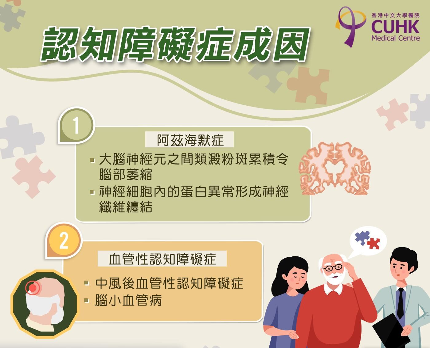 認知症,又稱腦退化症、失智症。不少人認為認知障礙症等於「老人痴呆症」。其實認知障礙症有很多成因,其中最普遍的是「阿茲海默症」(過往稱為「老人痴呆症」)。認知症患者表現為日常生活能力下降,逐漸不認識配偶、子女,穿衣、吃飯、大小便不能自理,有的還伴隨幻覺、譫妄、遊走等行為問題。