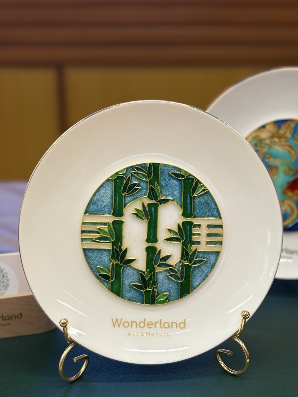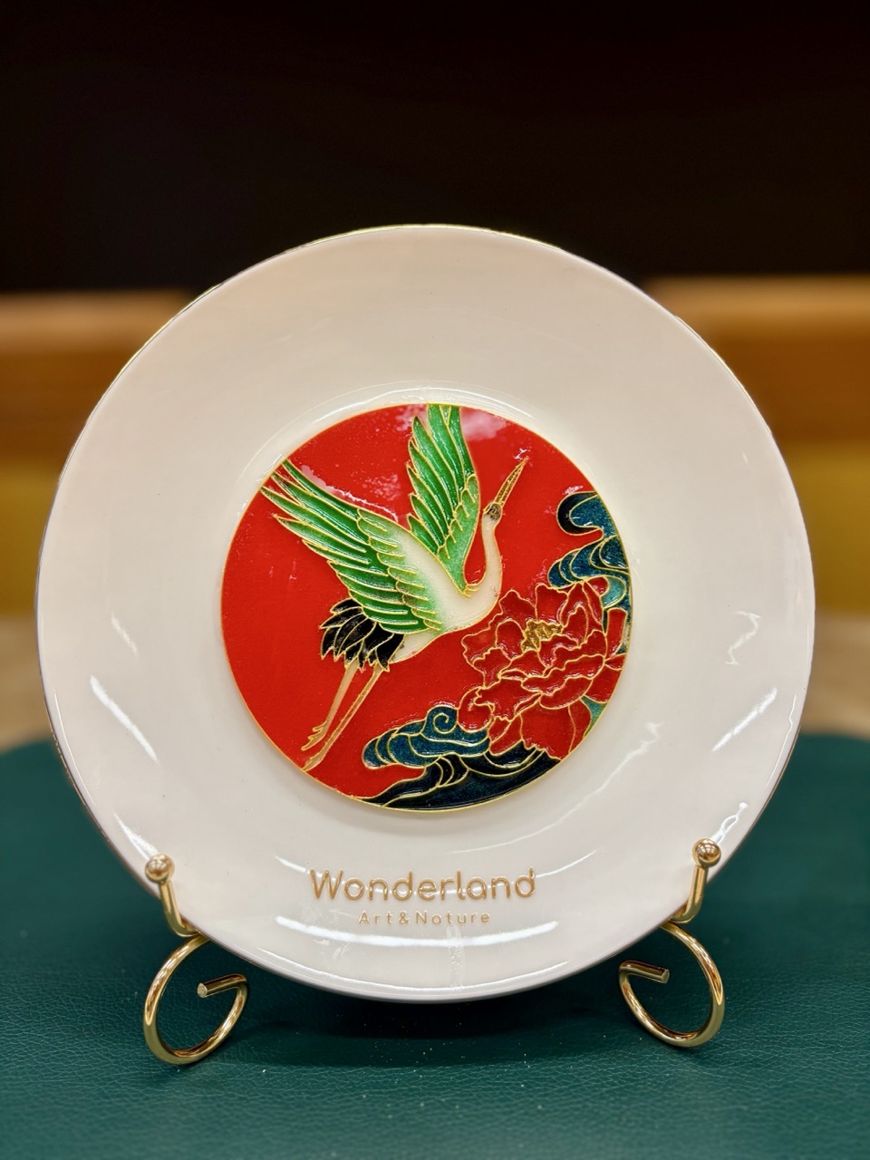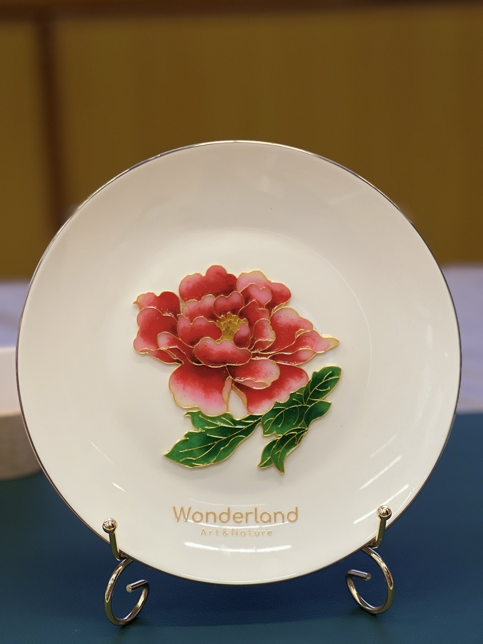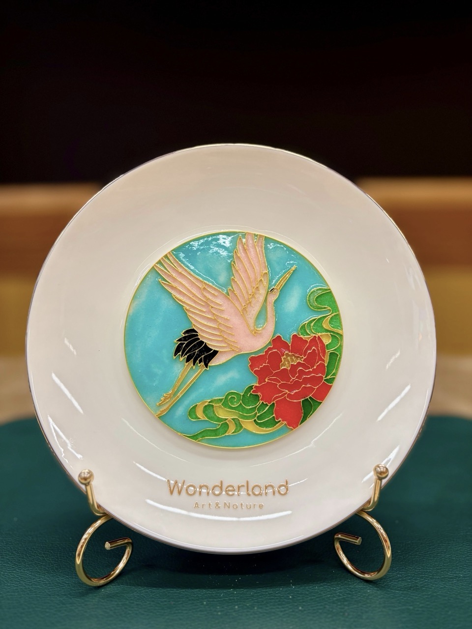 景泰藍(掐絲琺瑯畫),主要由仿金絲及琺瑯釉料製作而成,其脫胎於古老的景泰藍工藝——將宮廷御用琺瑯技法移植到畫板上的創意繪畫。