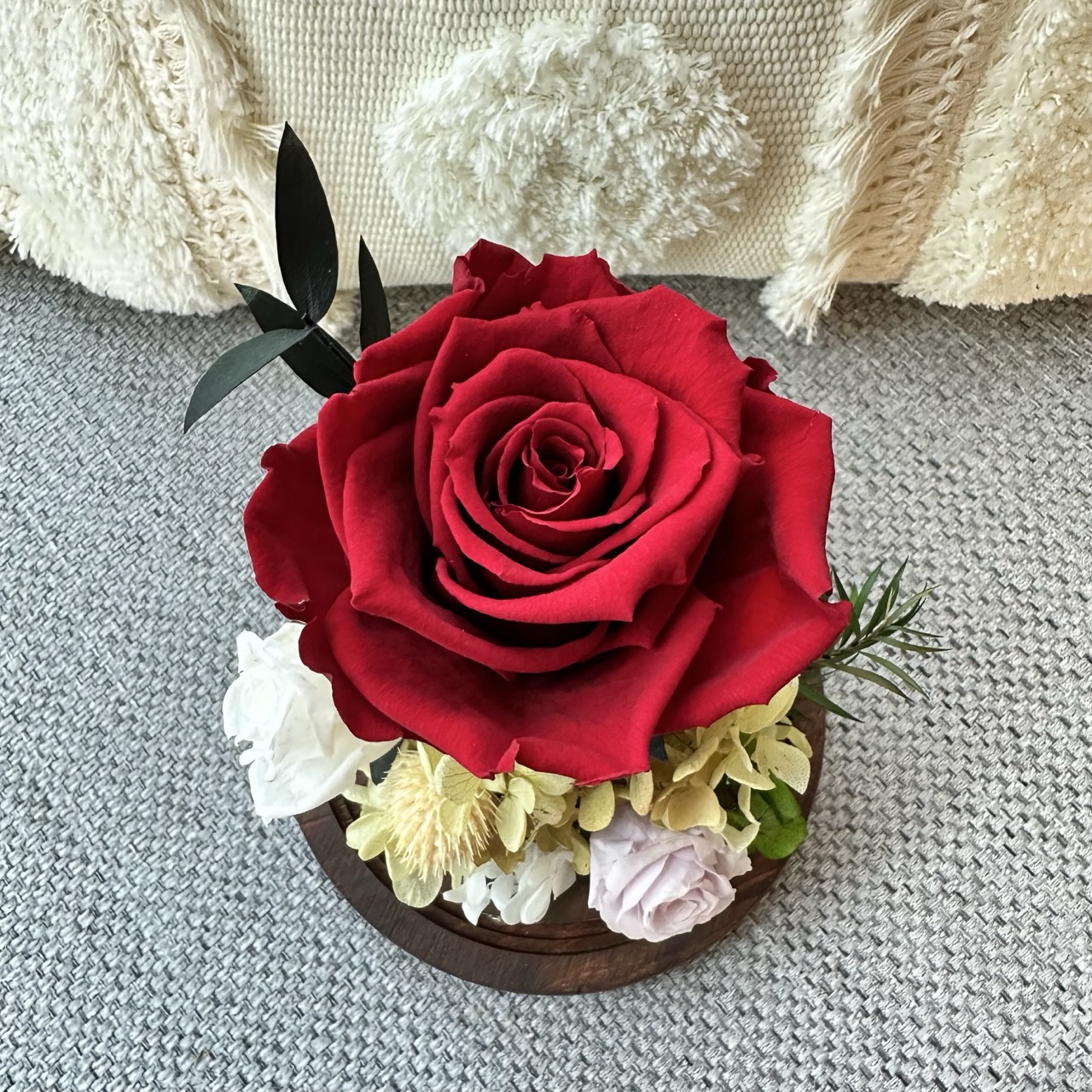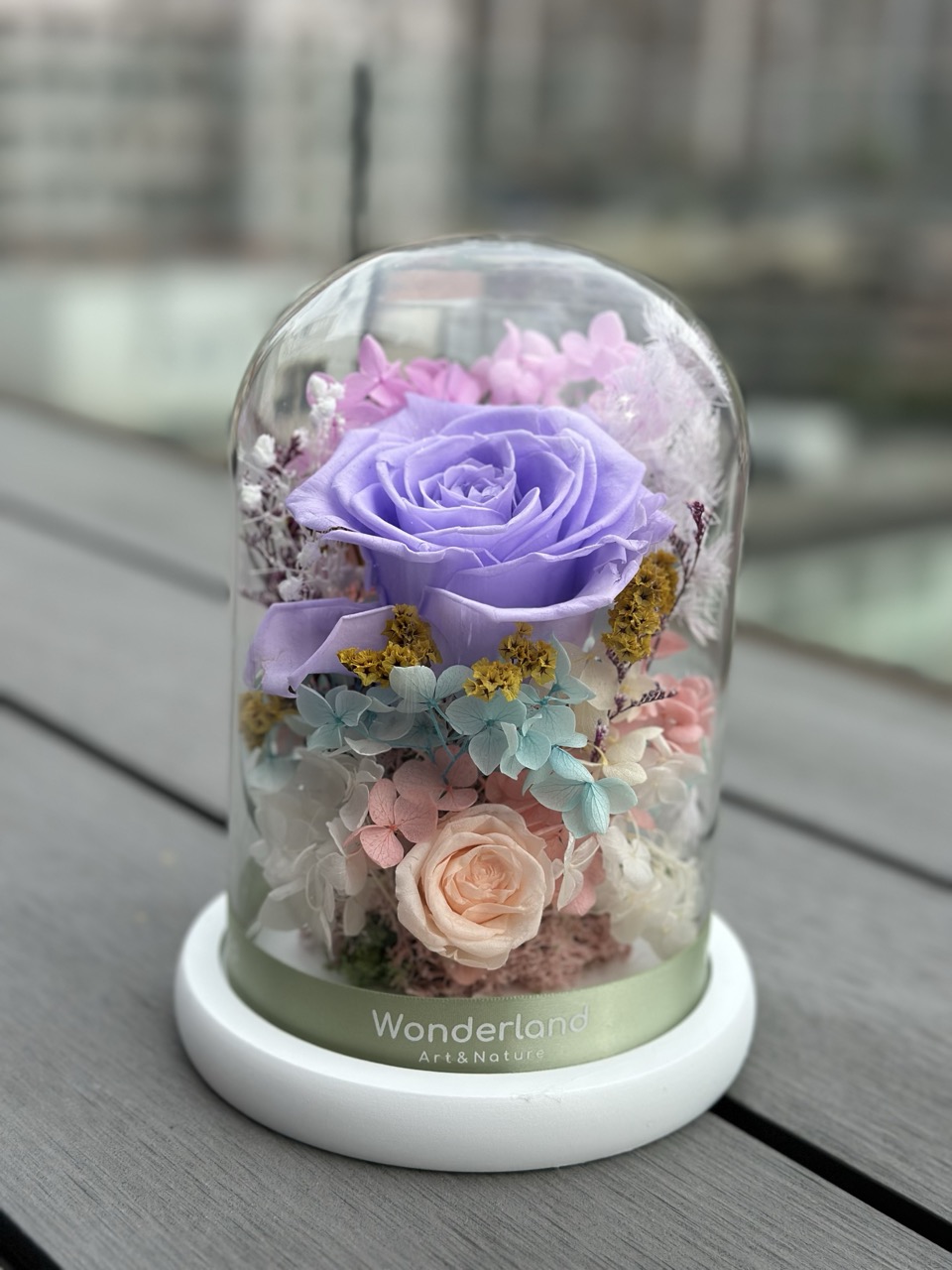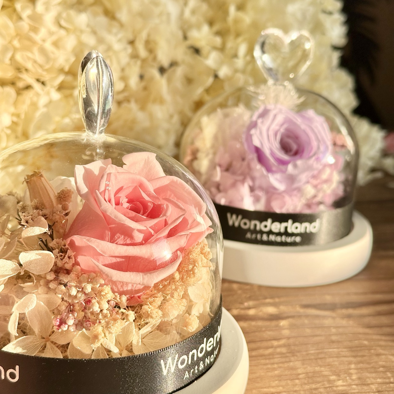 材料選用來自進口永生玫瑰、多款乾燥花、保鮮花/永生花及不同配飾,色澤持久;
