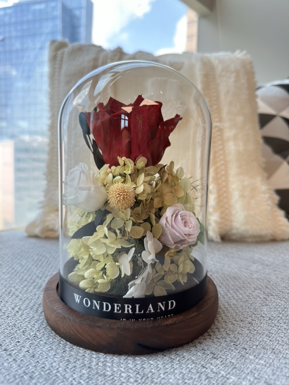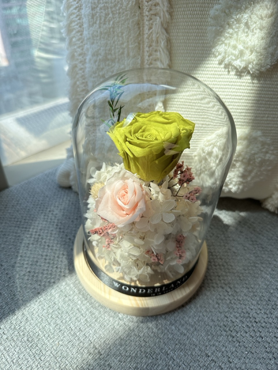 每次看著玻璃罩里的花朵,不僅有一種真實感,而且隨著光線不同角度的照射,會呈現不同的美感。