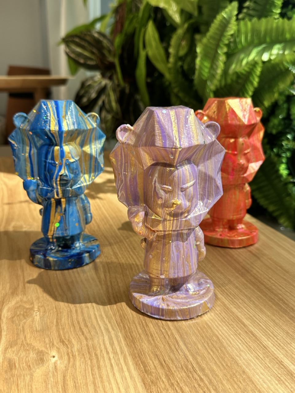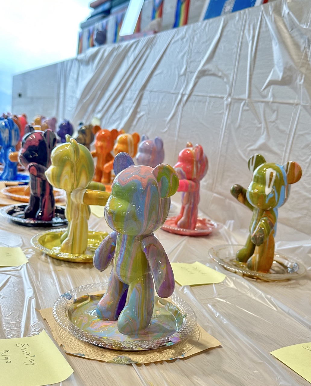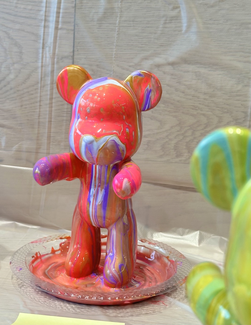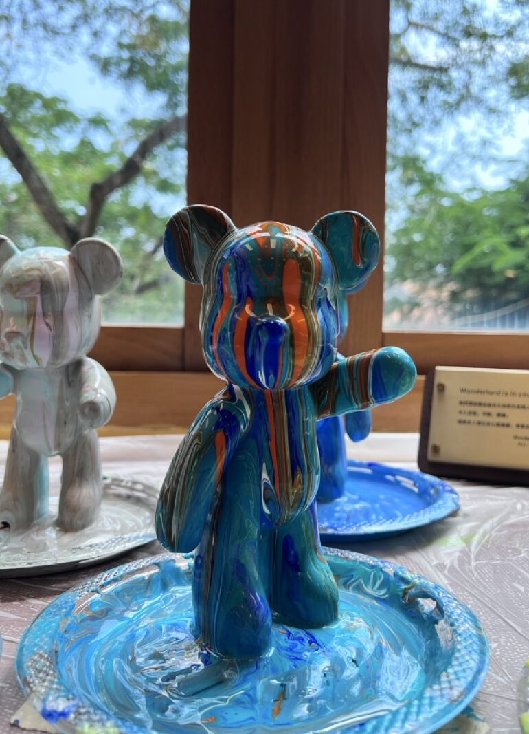 當流體藝術遇上動物,就有了沉浸式的澆淋體驗:整個製作過程只需選擇幾種顏料,調好後慢慢淋下,顏料逐漸覆蓋熊的全身,強烈的色塊對比在視覺上帶來衝擊感。