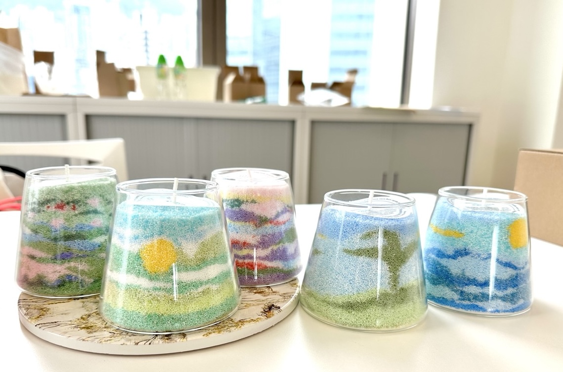 製作前,我們會讓參與者先找一幅自己喜歡的畫作,依照畫上的要素、配色,教授選擇合適的液體顏料來對蠟燭顆粒進行染色調配。同時,也會展現作畫技巧,以及注色、融沙、添香、貼芯、倒沙等注意事項。
