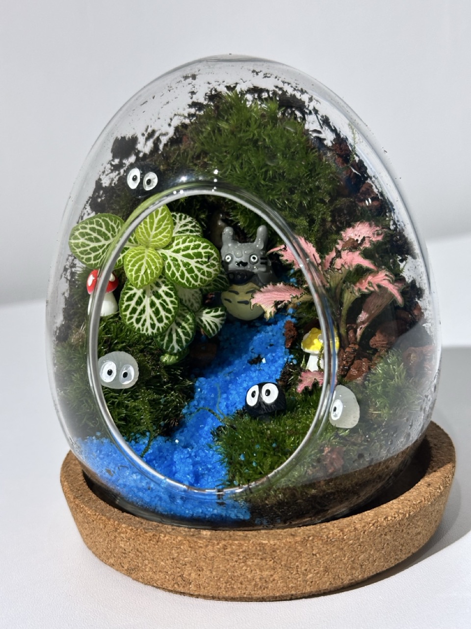以河流造景,兩側底部大面積採用永生苔蘚堆坡,用細白砂石鋪設,再滴灌藍色樹脂塑造湖水溪流,點綴植物,定做模型,由製作者貼合造景設計製作的造型,造就出超可愛的美景。